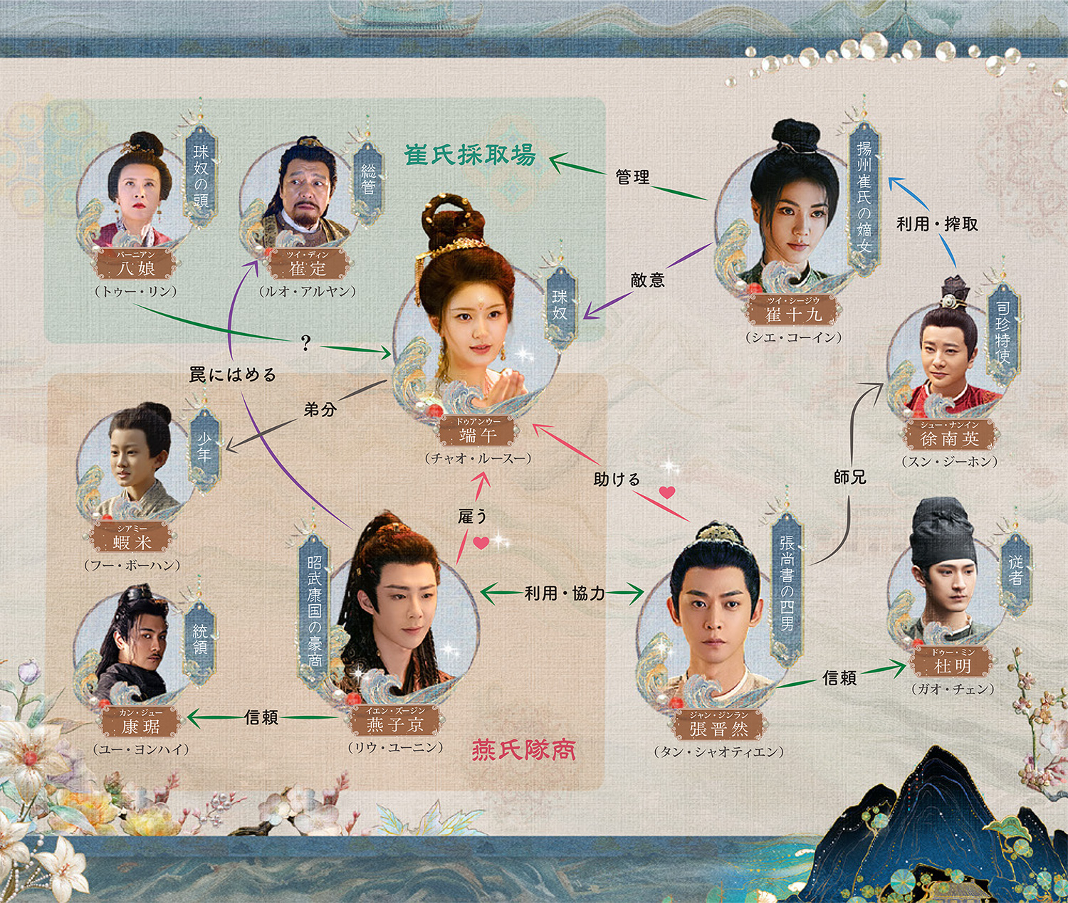 崔氏が3年連続で皇室に真珠を献上している合浦。そこでは珠奴と呼ばれる奴婢が命懸けで海に潜って真珠を採る生活を強いられていた。そんな珠奴の1人、命懸けで自由を求めた 端午は謎めいた書生・ 張晋然に救われた後、昭武康国の豪商・ 燕子京 の隊商に雇われる。それは彼女の本当の身分を知る手がかりとなる血珠を取り戻すためだった。これをきっかけに彼女はそれぞれ秘密の目的を抱えて暗躍する2人の男性と運命を交錯させていく。