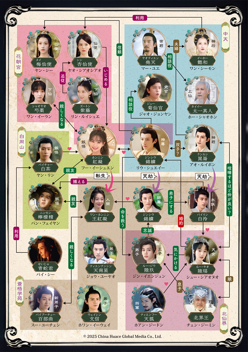 中国ドラマとして初めて男性花神を演じたのは「琉璃」「天命~白蛇の伝説~」「千古の愛、天上の詩」など数多くの仙侠ドラマに出演し“神仙のスペシャリスト”と言われるリウ・シュエイー。本作では花神・錦繍として、冷徹な神性と抑えきれない情愛を併せ持つ複雑な人物像を体現し、仙侠ドラマにおける新たなキャラクターの一つを確立した。そして無垢な少女から覚醒する女性までの感情振幅の大きい役柄を自然に表現し、物語没入度を高めるタイプの主演女優の一人であるフー・イーシュエンは、本作でも真摯に役に挑み“実力派俳優”へまた一歩成長した姿を視聴者に魅せた。